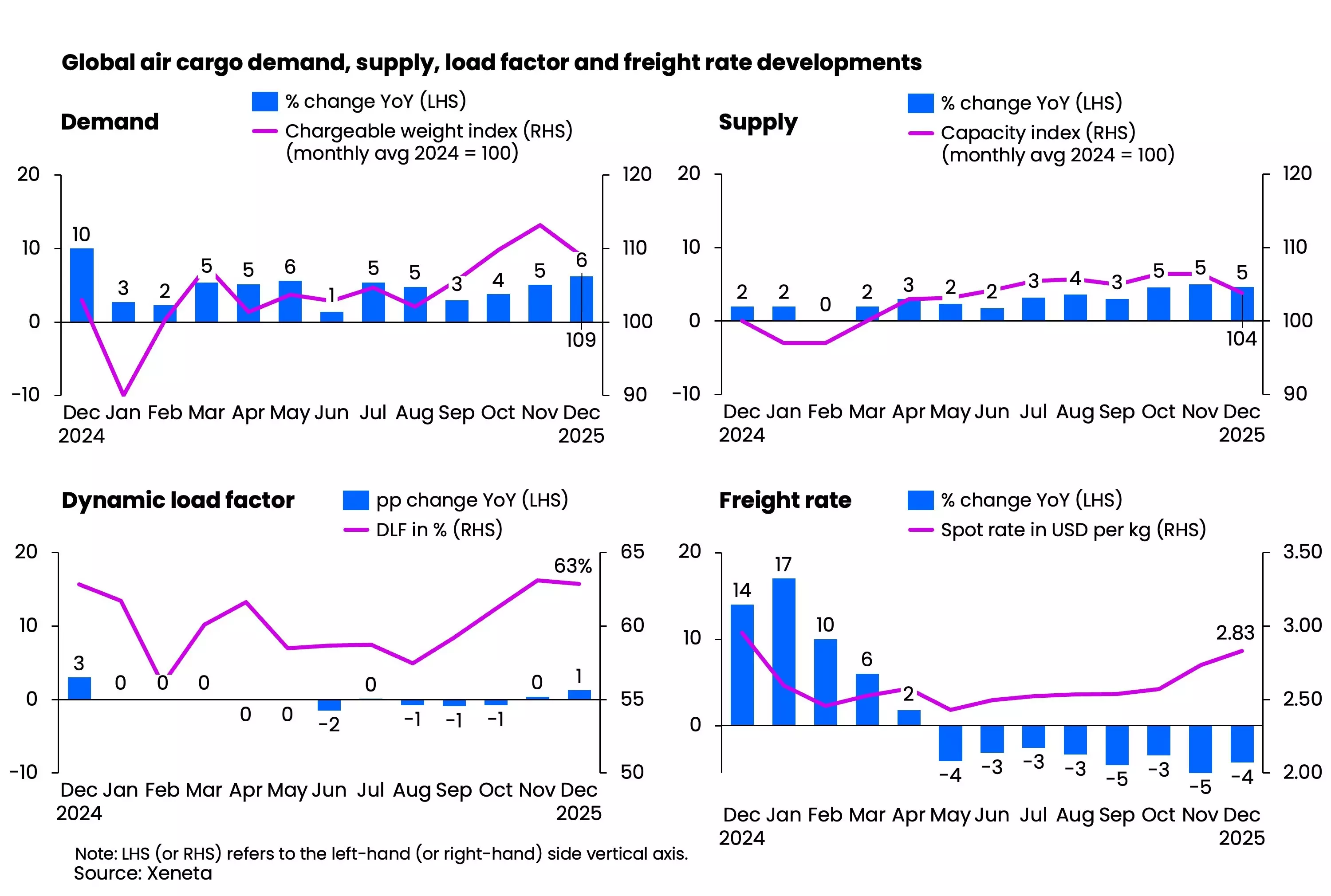 Despite the late-year increase in demand, global airfreight rates remained below their 2024 levels. In December, average global airfreight rates fell 4% year on year to USD 2.83 per kg. This followed a similar trend seen in recent months, even as demand continued to grow faster than supply. In December, supply increased by 5%, but this was still outpaced by demand growth.